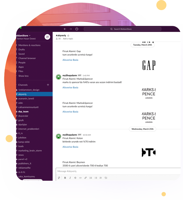 myShopalarm, ReklamStore Affiliate kampanyalarının kupon kodu ve indirimlerinden haberdar olmak ve aynı zamanda bu indirimler üzerinden elde edilen satışlara kazanç ortaklığı çözümü sunmak amacıyla Telegram ve Slack platformlarında geliştirilmiş bir alışveriş uygulamasıdır.